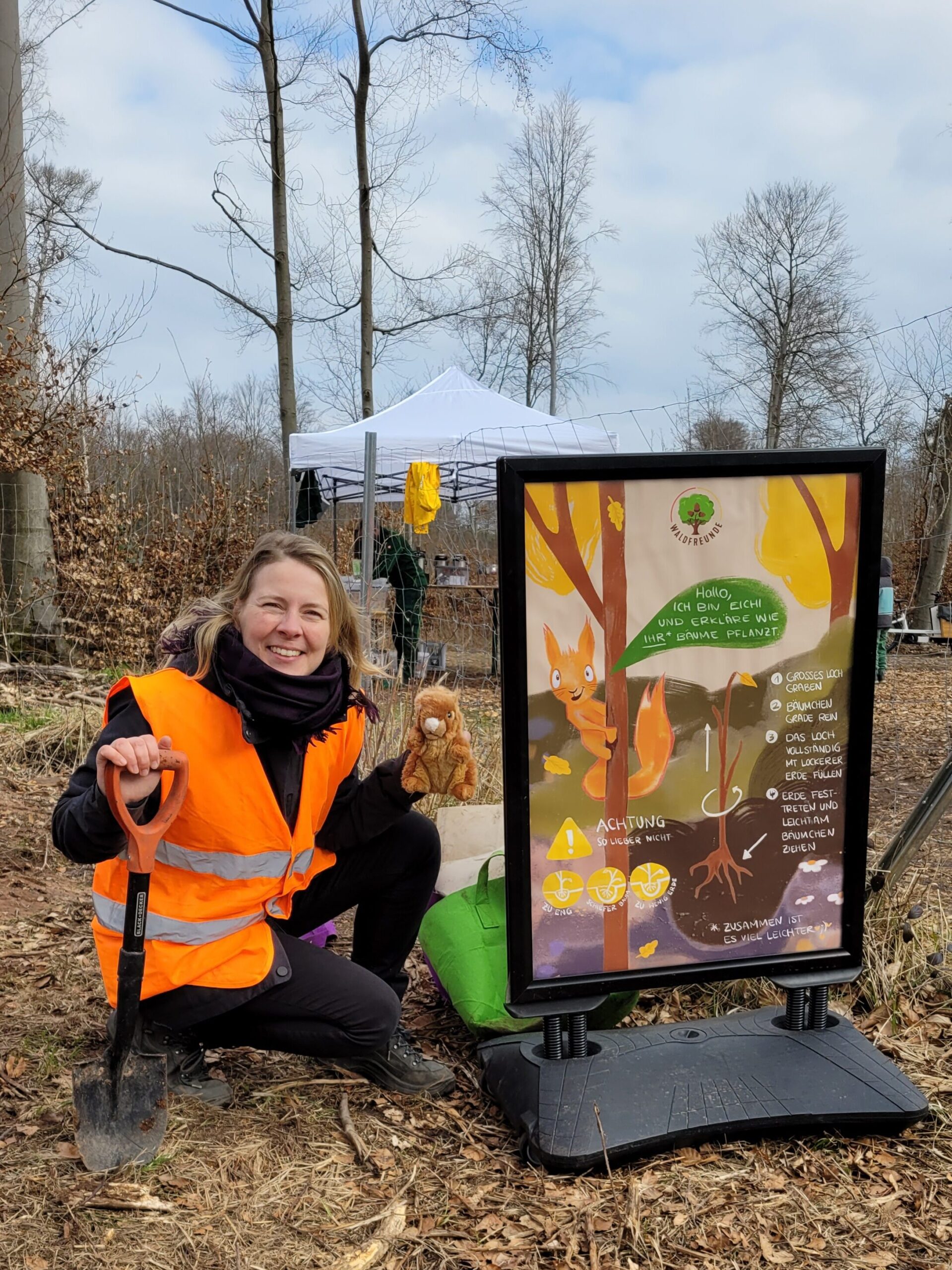 Tina Teucher bei einer Baumpflanzaktion mit den Waldfreunden: Die Geschichte von Eichi dem Eichhörnchen inspirierte nicht nur die Kleinsten, den Wert des Ökosystems Wald besser zu verstehen.
