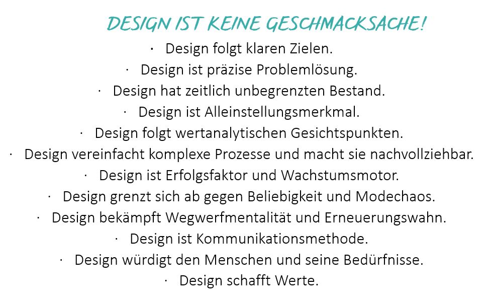Nachhaltiges und qualitativ hochwertiges Design muss somit „geschmacklos“ sein, also losgelöst von schnelllebigen Trends und Modechaos. Durch eine klare Zielsetzung im Designprozess haben Designer die Chance, Probleme präzise zu lösen und so der Wegwerfmentalität und dem Erneuerungswahn entgegenzuwirken.